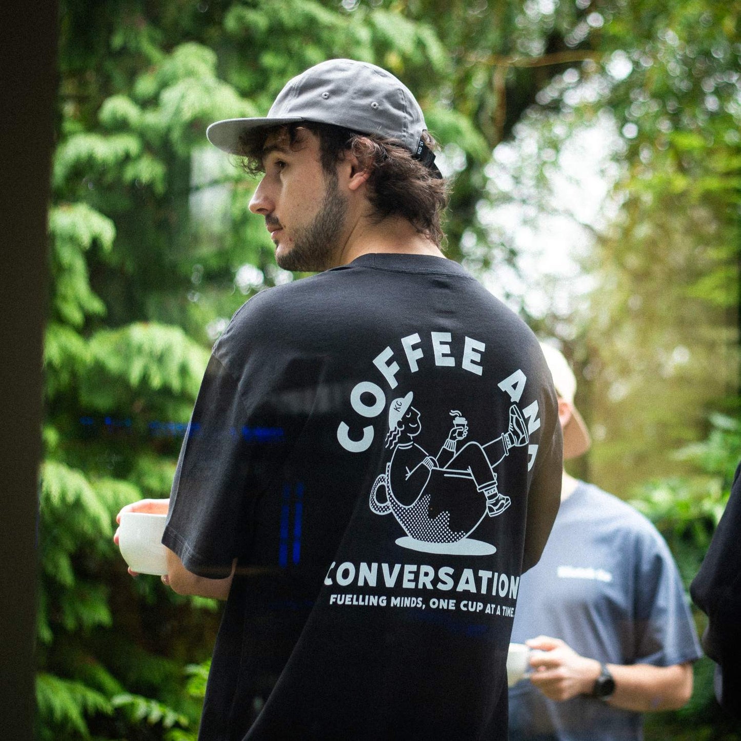 The Coffee & Convos Black Tee is the one you throw on when the day could go anywhere — a quick brew that turns into a long catch-up, a spin across town, a late-night debrief on a park bench. Clean, easy, and unfussy, it lets the moment do the talking.